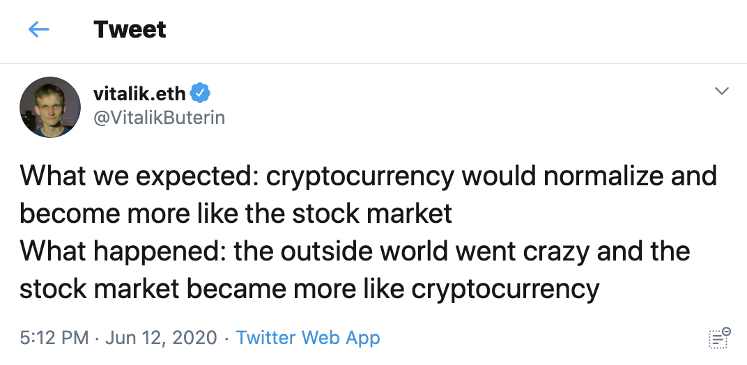 In of the latest tweets, Vitalik Buterin compared the cryptocurrency market with the traditional one. He mentioned that cryptocurrency should have been as stocks, however, the result was completely different.