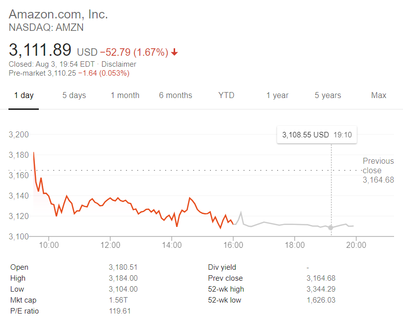 Despite total market gains, Amazon stock price dropped by -1.67% to $3,111.89 on Monday. Amazon shares closed at $232.40 below the 52-week high ($3,344.29) that was set on July 13.